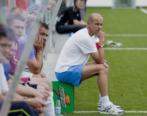 Welke hockeyregels zou het voetbal onmiddellijk moeten overnemen als het aan jou ligt? ‘Het voetballen zou veel aan snelheid winnen door het invoeren van de zuivere speeltijd. Het zeuren door de coach tegen de arbitrage wordt bestraft met een speler minder in het veld. Ook de selfpass is een goede regel; het tempo wordt hoger en het nadeel van een speler minder in het veld wanneer een team de bal ingooit bij het voetballen wordt zo teniet gedaan. De macht van de strafcorner vind ik persoonlijk overtrokken; een goede aanvallende strafcorner kan veel tekortkomingen in het aanvallen, omschakelen en verdedigen verbloemen. Maar het blijft natuurlijk een gevaarlijk wapen, dus we besteden daar wel aandacht aan.’